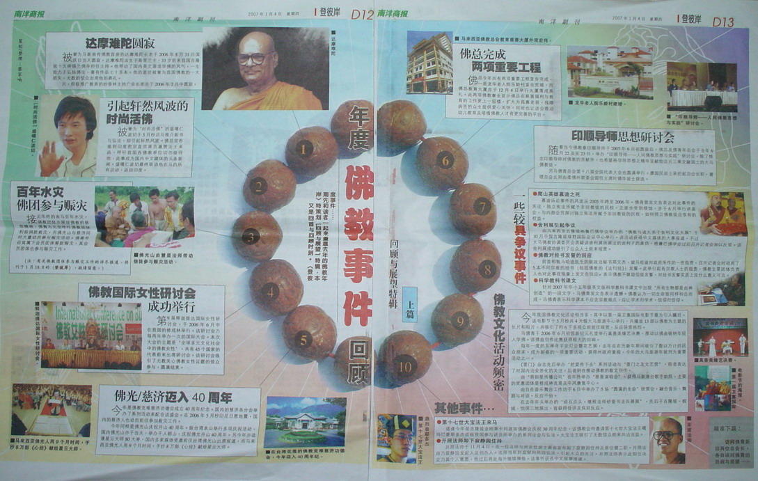 1月4日及11日刊出「2006年大马佛教回顾与展望特辑」,十大重要新闻中收录有马来西亚佛光山及国际佛光会马来西亚协会在国内积极推动人间佛教的努力,以及化世益人的行佛纪实,特此摘录如下,以飨读者: