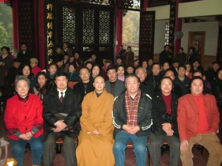 重庆佛教在线讯 2007年元月1日,正值元旦佳节来临,重庆市各界人士济济一堂,欢聚弘法楼,在一片热闹声中,隆重举行“华岩佛教展”开幕式。参加开幕式的有重庆市政协副主席、原副市长窦瑞华、解放军二炮西南科技委主任曾令明、解放军二炮重庆军代局局长蔡新明、中国人民解放军原后工政治部主任郭俊、重庆市委统战部副部长周传航、重庆出版社原社长李成敏、重庆市石文化艺术创作协会会长温学礼、重庆民俗摄影家协会会长项大庚、中国美协会员、渝中区美协主席曾令富、重庆简而文饮食公司董事长蒲素珍、华岩寺方丈道坚法师及众多艺术家等。开幕式由组委会胡怀东主持,道坚法师作重要讲话。在众多艺术家一起合影后,“华岩佛教展”开幕式圆满结束。
