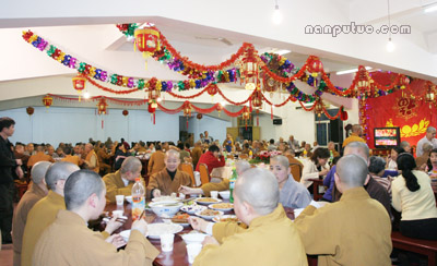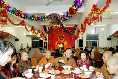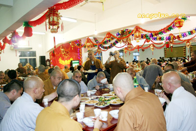 2月17日下午四时许,南普陀寺除夕晚宴在斋堂举行。南普陀寺方丈则悟大和尚携诸位执事参加晚宴并到每桌问候,斋堂里一派节日的祥和。