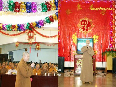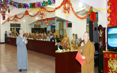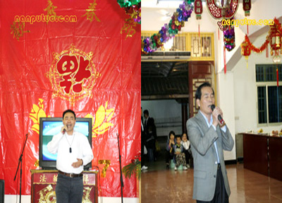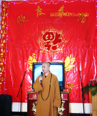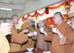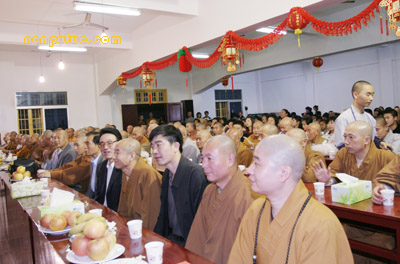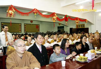 六时左右,南普陀寺大知客妙真法师宣布一年一度的普茶联欢晚会开始。首先恭请方丈致新春祝福与开示,则悟大和尚简要回顾了2006年南普陀寺在各级政府特别是市宗教局的领导和关怀下取得的一系列重大进展:规范了后山景区的整体布局;落实了寺院周边建筑规划的方案;启动了对大殿等的百年大修工程;拓宽了弘法的途径与理念等等。最后大和尚率两序大众对所有关心、支持南普陀寺发展与建设的各界人士表示诚挚的谢意,对晚会现场的领导、嘉宾等致以新年的祝愿。前来参加晚会的有市宗教局钟晓波先生、世界佛教报社诗洋社长伉俪、实业社曾全民主任等。