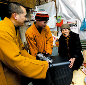 下午5点,道坚法师来到归元寺前巷66号旁,一间低矮的屋子里摆着两张床,81岁的张立君老人正在给躺在床上的儿子熬药。“老人家,给您拜个年。”道坚法师热情地拉着老人颤抖的手说:“我从重庆商报记者处知道了您的梦想后,特别给您买来一台电视机,还有这些米、油让你们过个好年。”接着,道坚法师拿出200元现金,鼓励老人的儿子说:“有病要想办法去看医生,你把身体养好了才能照顾老人。”一席温情的话说得大伙泪花花儿直转,在场的邻居代女士也跟着哭了起来。