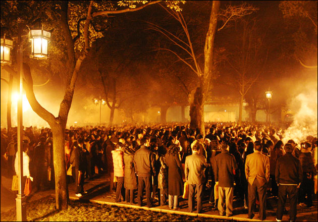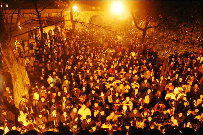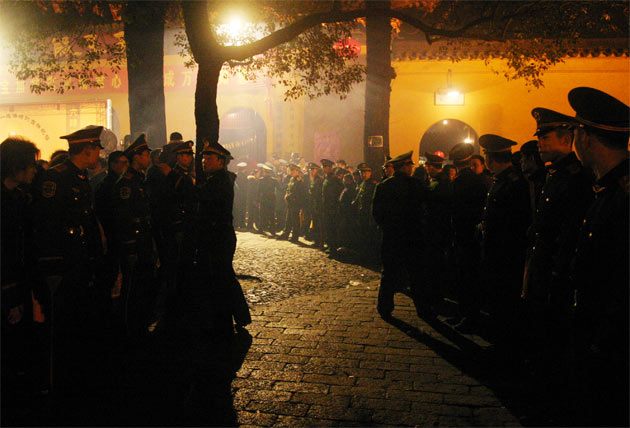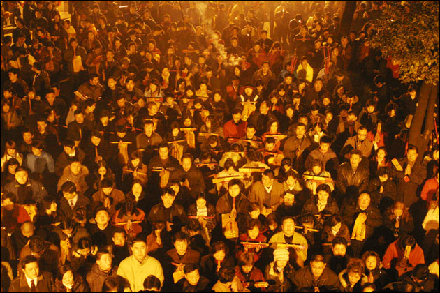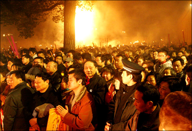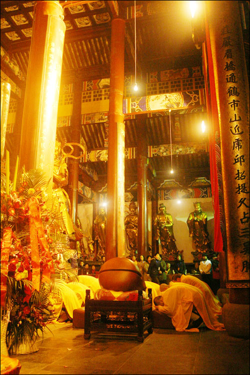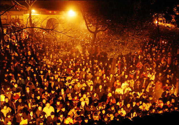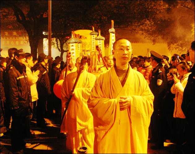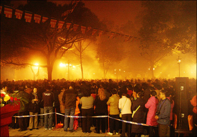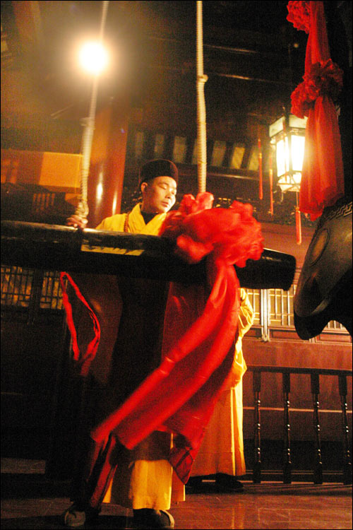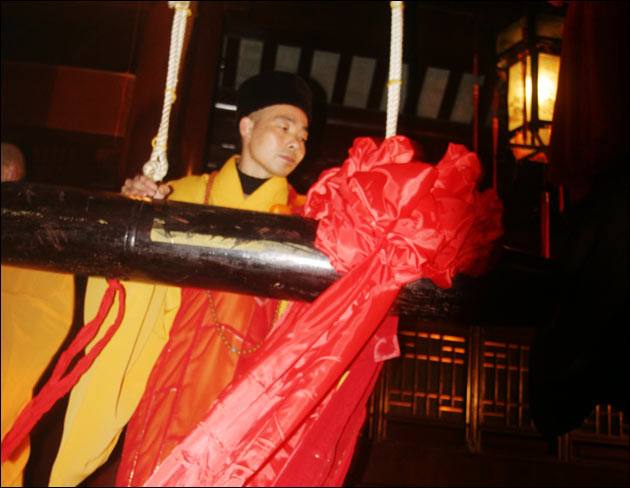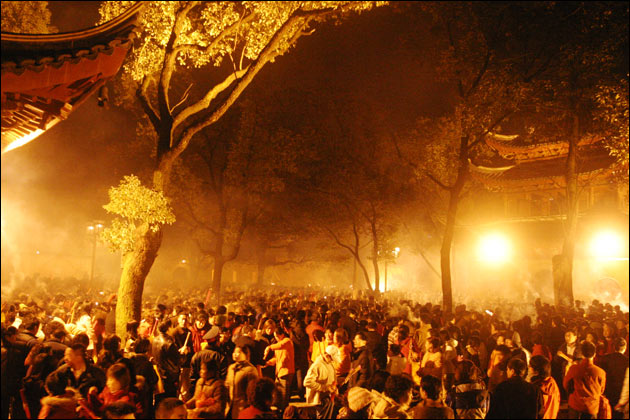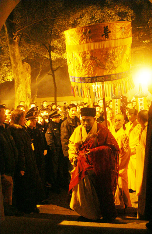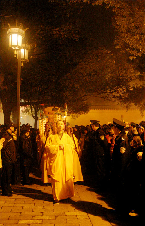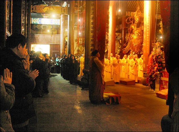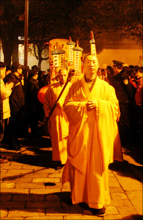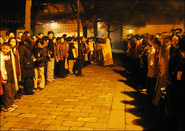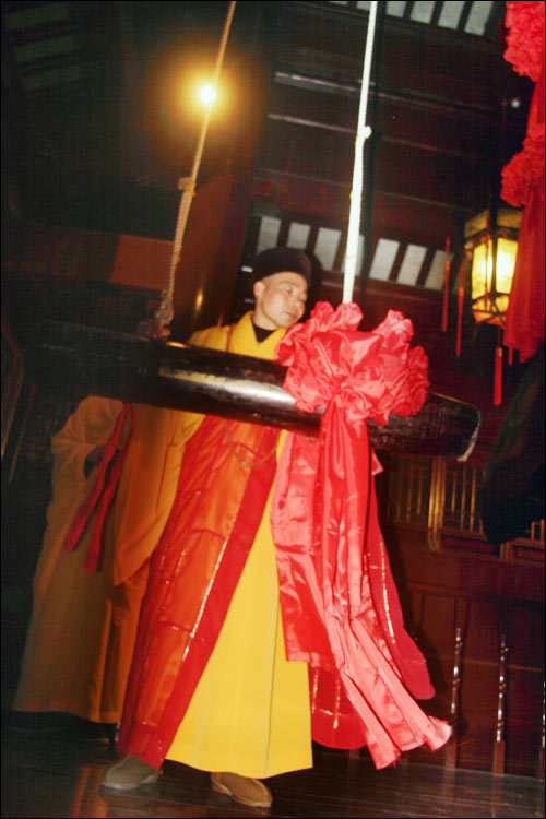 除夕之夜十一点,大雄宝殿内举行了诵经法会,于辞旧迎新之际祈祷世界和平,人民安乐。随后,西园寺住持普仁大和尚在幢幡、华盖的簇拥下前往钟楼,敲响了新年钟声,以一百零八响的悠长钟声,衷心祈愿苏州民众及法界一切有情“闻钟声,烦恼轻,智慧长,菩提增”。每一次钟声响起之际,钟楼下的数千信众皆自发向钟楼或天王殿合十鞠躬问讯,虔诚感人。