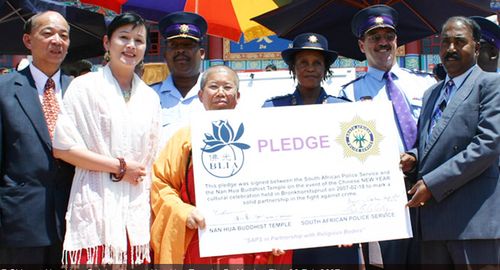 相当引人注目的是当天由南华寺住持依淳法师、南非全国安全部警察服务署人事处总监诺莫尼(Dr. Nomoyi)女士、豪登省警察总监奈度(P. Naidoo)、南非国会议员及南华寺信徒代表陈阡蕙女士共同签署的“合作关怀备忘录”,这是南非佛教界首次就关怀警察、百姓及社会需要作出的正式宣示,从中外人士热烈的掌声可以看出,南非百姓欢迎南华寺加入打击犯罪阵营,备忘录的签署给人们燃起新希望。