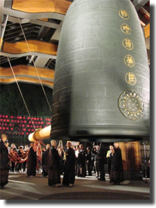 综合台湾“中央社”、“中时电子报”报道,位于台北县金山乡的法鼓山今年首度于除夕夜撞响108响的跨年钟声,整场撞钟仪式自除夕夜晚间10时开始,由圣严法师、方丈和尚果东法师、法鼓山四众护法接力撞钟,并于子夜12时整,由圣严法师撞满最后一响。