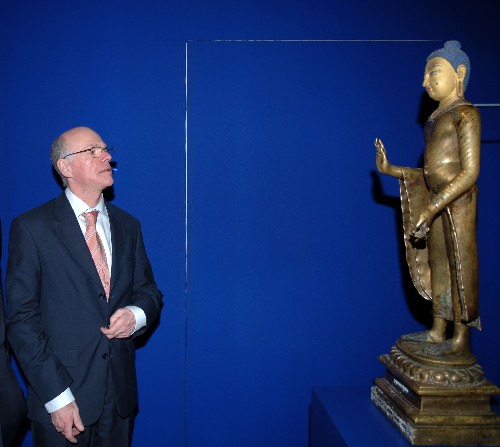 2月20日,在德国首都柏林的亚洲艺术博物馆,德国联邦议院议长拉默特观赏一尊公元5世纪的释迦牟尼塑像。