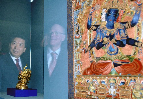 2月20日,在德国首都柏林的亚洲艺术博物馆,德国联邦议院议长拉默特(右)与中国驻德国大使马灿荣(左)观赏西藏唐卡时身影投射在橱窗玻璃上。