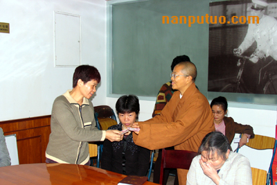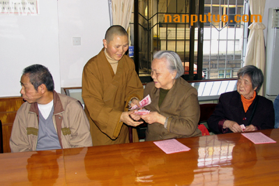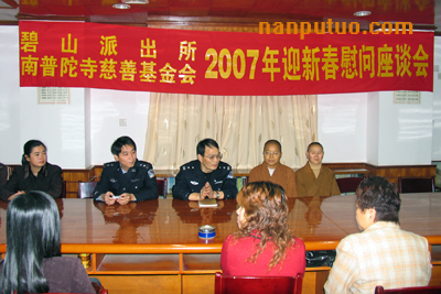 2月8日上午,受会长圣辉大和尚的委托,普陀法师、德鸣法师出席了在本市思明区碧山派出所举行的“碧山派出所、南普陀寺慈善会2007年迎新春慰问座谈会”。普陀法师向厦港街道的39户贫困居民拜年,并为贫困户送上慰问金和泰金香米、食用油等慰问品,共用善款12300多元。