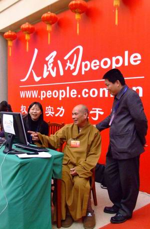 荣波法师(右)做客人民网广西视窗2007广西“两会”直播专题“嘉宾访谈”节目