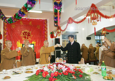 南普陀寺方丈则悟法师为全山大众致新春的祝福,他并简要回顾了2006年南普陀寺在各级政府特别是厦门市宗教局的领导和关怀下取得的一系列重大进展。前往参加南普陀寺普茶联欢晚会的有厦门市宗教局钟晓波先生、世界佛教报社诗洋社长伉俪、实业社曾全民主任等。