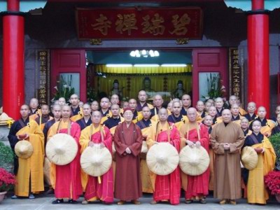理事长净良长老与托钵队伍于碧瑞禅寺殿前合影