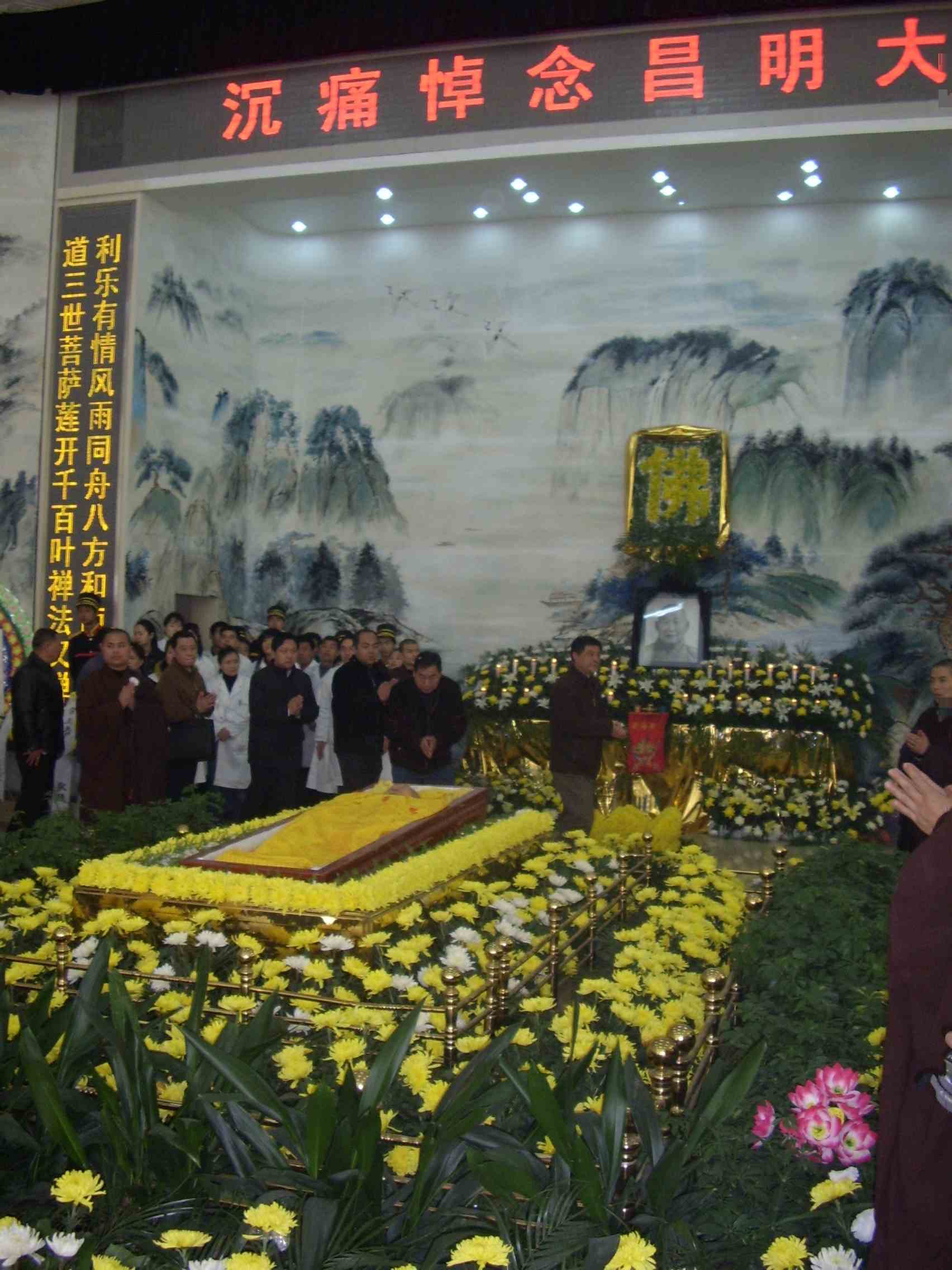 2月5日上午,昌明大和尚遗体告别仪式在武昌殡仪馆隆重举行。参加遗体告别仪式的省、市领导有:杨松、苏晓云、苗圩、王守海、韩忠学、蒋大国、陈春林、李宪生、叶金生、袁善腊、贾耀斌、黄楚平、杨云彦、郑心穗;省、市老领导有:谢培栋、刘善璧、李梅芳、何其雄、王功安、张绪等。