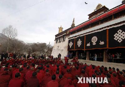 据新华网报道:3月1日,拉萨色拉寺措钦大殿前举行新年祈祷法会辩经活动。