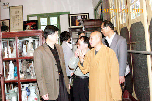 随后,南普陀寺堂主,闽南佛学院教务长传明法师陪长老一行参观了大悲殿、法堂、藏经阁、禅堂等。参观过程中,日本客人对于明朝何朝宗制作的瓷观音坐像、明代沙弥尼血书法华经颇为称道。宾主双方还对禅堂仪轨和文物古迹保护等问题交流了看法。