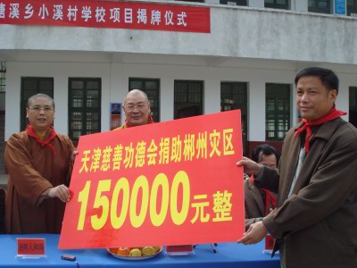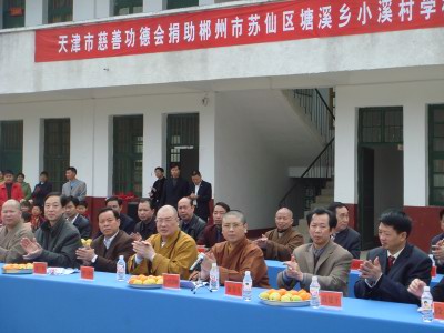 2006年入夏以来,由于受第4、5号台风的强烈影响,湖南省郴州地区遭受到500年一遇的特大洪灾,郴州市普降暴雨引发山洪泥石流冲毁房屋10万余间、受灾农田13.7万公顷,公路、桥梁、水利、电力及通讯等基础设施损毁严重。造成355人死亡、112人失踪,郴州全市受灾人口400多万,近10万人无家可归。在715、726两次洪灾中,苏仙区小溪村小学的围墙、草坪、校舍损失严重,不能正常开学上课。中国佛教协会即时下发了《为湖南郴州市特大洪灾募捐吁请书》。我会得知这个消息后,立即组织天津市佛教慈善功德基金会的理事、名誉理事、会员积极开展捐助与奉献,很快募集到善款15万元。经过半年的修缮,终于迎来校舍竣工、落成剪彩的喜悦。