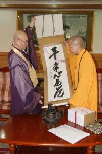 向长老介绍大佛绘制缘起 向柏林禅寺赠送书法