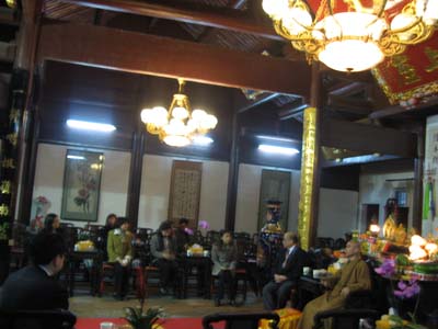 诚信法师向客人简要地介绍了天童禅寺一千七百多年的历史,及现在寺院的情况。客人们听了法师的介绍后个个法喜充满 。