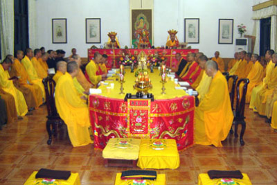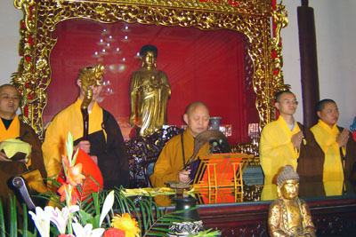 兹有本寺护法深圳黄楚龙先生合家、北京郝合明居士合家、河北任进生居士合家及各善信人等,来山恭请戒德净侣,虔修法界圣凡水陆普度大斋胜会道场佛事一坛,于本年农历二月初九啟经,至十五日圆满送圣。伏愿以此所修经忏诸善功德,仰祈三宝诸天诸神,宏施护佑之恩,大啟超生之路,冥阳两利,福慧双修,所求如意,无愿不遂。虽然如是,即令水陆道场佛事宏开,斋主虔诚设供,三宝龙天普降道场一句,应如何赞扬?