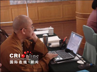 宗教委员学诚法师在讨论过程中用笔记本电脑记录委员发言