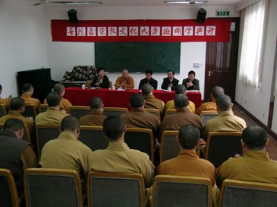 长春法师在致辞中回顾了玉佛寺近年来在僧职培养方面所做的工作。2004年10月与上海外国语大学联合创办的法师外语专修班,专门修习英、法、德、日、韩等语种,再过两三年他们就能完成学业、投入工作,为2008年北京奥运会和2010年上海世博会服务;2005年9月和2006年7月,与上海交大合作创办了两届MBA课程研修班,组织全寺中高层负责人到交大安泰管理学院集中学习MBA管理课程,以进一步提高宗教场所的现代化管理水平。在此基础上,为了将培训的对象扩展到全寺有培养前途的各位青年法师,将培养目标锁定在全面提升宗教教职人员的文化素质上。2006年5月成立了玉佛寺高复班,经过半年时间的集中培训,所有37名学员全部通过成人大专入学考试。在今后三年的学习时间里接受华东师大哲学系的系统教学,完成国民教育序列成人大专规定的全部课程。