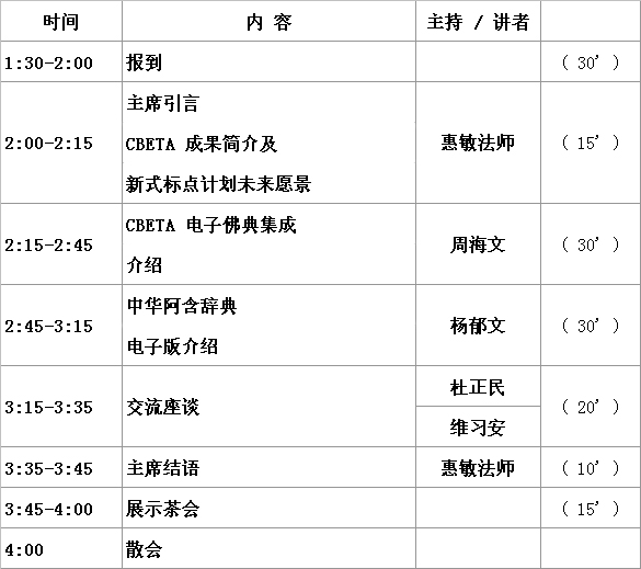 据法鼓山全球资讯网及中华电子佛典协会报道: 为了提供更优质的电子佛典,便利大众理解及研究佛教义理,中华电子佛典协会(以下简称CBETA)在三月十日(星期六)下午二时,在台北市慧日讲堂举办电子佛典成果发表会暨九周年庆活动,由法鼓山僧团首座和尚,同时也是中华电子佛典协会主任委员惠敏法师主持。出席盛会的有台北大学古典文献研究所所长王国良、台湾大学历史系教授周伯戡、日本东京大学教授维习安、佛光大学宗教学系教授游祥洲、佛陀教育基金会林拥欣及慧日讲堂厚观法师及法鼓山果兴法师等近百人参加。