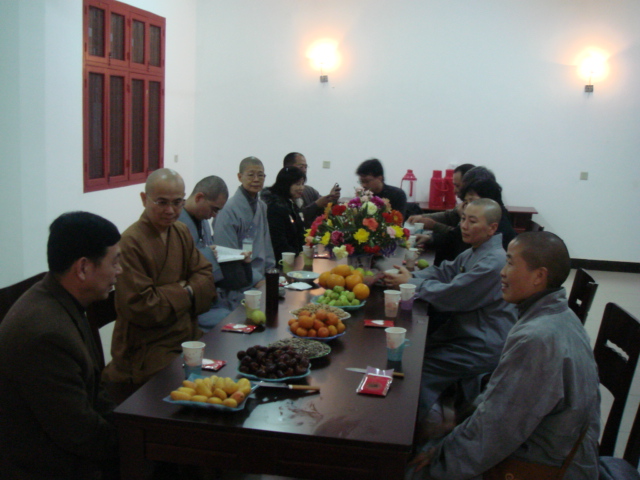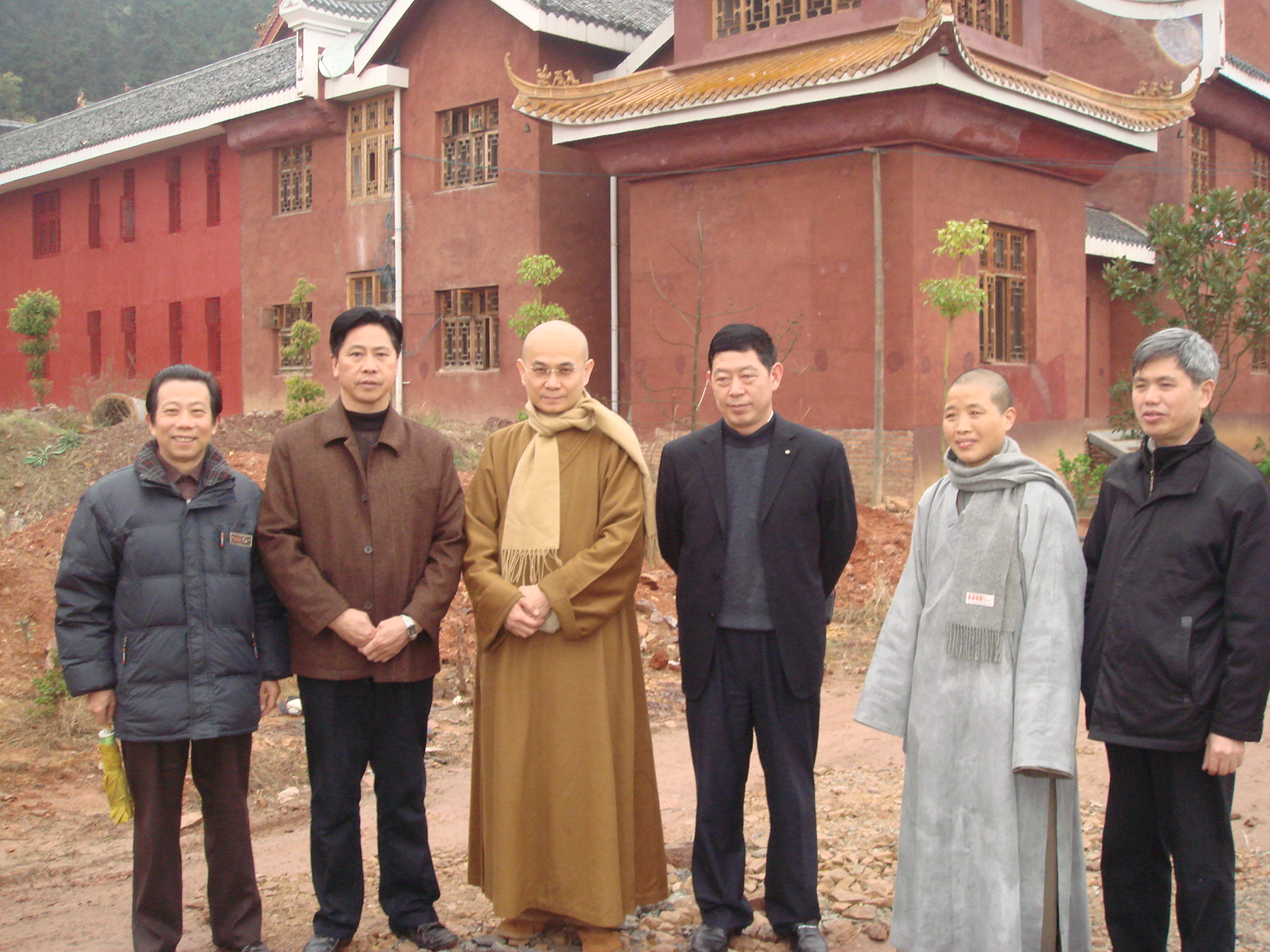 前来会见惠敏法师一行的县委常委雷泽逸(左二),民宗局长(右三),文化局领导(左一)与惠敏法师,大智法师,徐教授合影留念