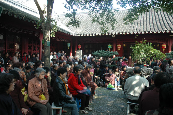 9点,报恩寺四众弟子代表迎请大安法师登台说法,千余听众听讲。