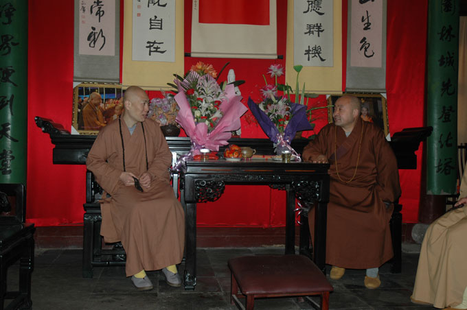 早上8点,报恩寺、报国寺住持弘法法师热情接待了庐山东林寺弘法团大安法师一行,并与大安法师热情交谈。