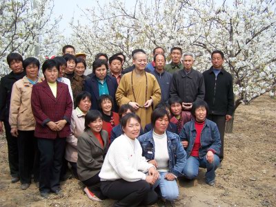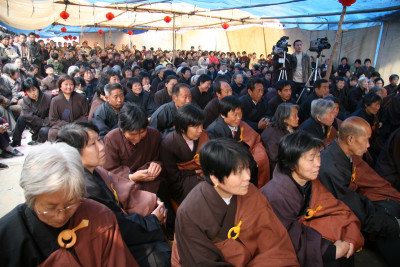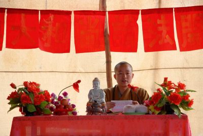 居士们在曹庄观音院前的空地上搭起棚子,明海法师在这里为大家进行了两个小时的开示,告诉大家如何在生活中实践佛法,做一个正信的佛教徒。开示后,法师为在场大众传授了三皈五戒。