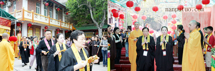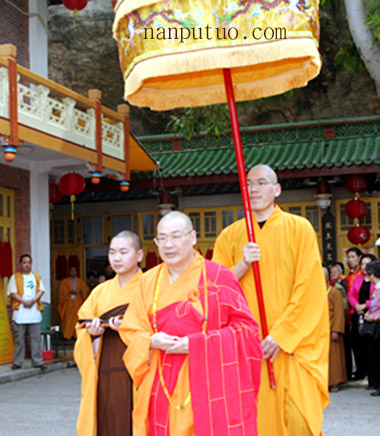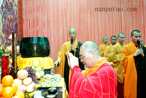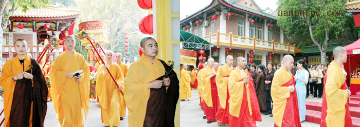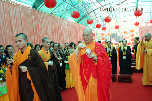 4月14日下午2时许,举行了本次水陆法会的熏坛、洒净仪式。寺内各大水陆坛场布置整齐,庄严有序,幡灯呼应,彩旗和香花共相贺彩。首先,监坛中观法师指引仪仗队、率领众斋主在乐器梵音的相伴下来到丈室迎请主法大和尚;一时,虎溪岩寺内钟鼓齐鸣,场面肃穆庄严,方丈上圣下辉大和尚端坐于方丈室中,在迎请者挚诚三请后随队伍缓行至大雄宝殿。炉香唱赞声中,大和尚开始拈香礼佛;斋主依次上香祈愿。紧接着大悲咒梵呗声不断,大和尚执持杨枝净水依次遍洒虎溪岩寺水陆道场的各大坛口。