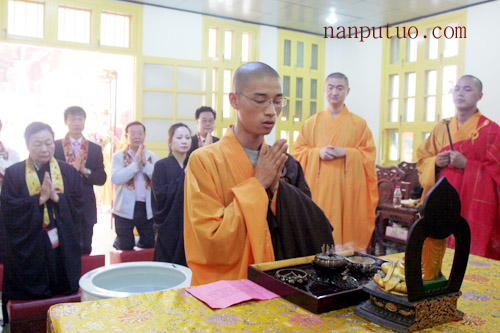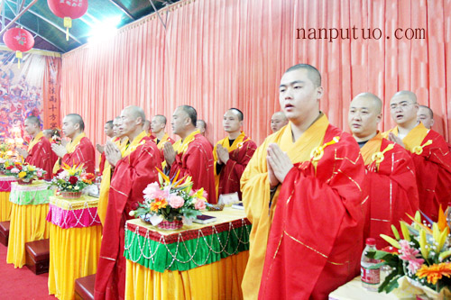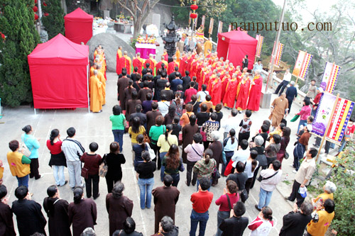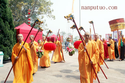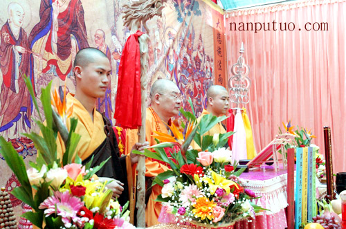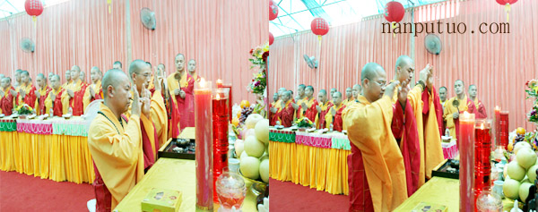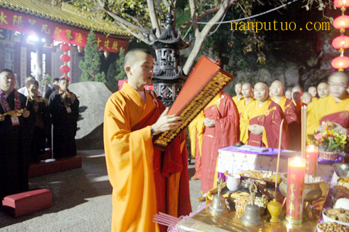 凌晨4:30分,僧俗四众井然有序列位于大坛内外,方丈上圣下辉大和尚在仪仗队的迎请下,缓行至大坛。香赞声中,大和尚拈香礼佛,水陆法会会首郑展伟居士、副会首陈惠英居士等信众亦上香礼拜。早课绕佛时,行出至大雄宝殿前的坛场进行请灵,即派遣鬼使神差发符,上呈诸佛、菩萨及所有天神;下召六道众生,请大家都来赴会。