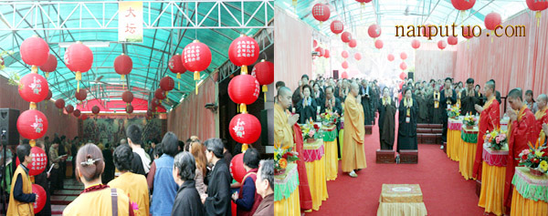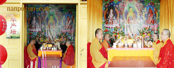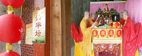 4月15日,虎溪岩寺水陆空大法会正式开始。凌晨的虎溪岩,灯笼高悬,彩球高扬,灯烛相映;大雄宝殿左前方的刹竿上高悬"修建法界圣凡水陆普度大斋胜会功德”之长形旗旛;各坛内供桌上皆罗列香花灯果等供品;信众沐手梵香、身著海青,虔诚参加水陆法会。
