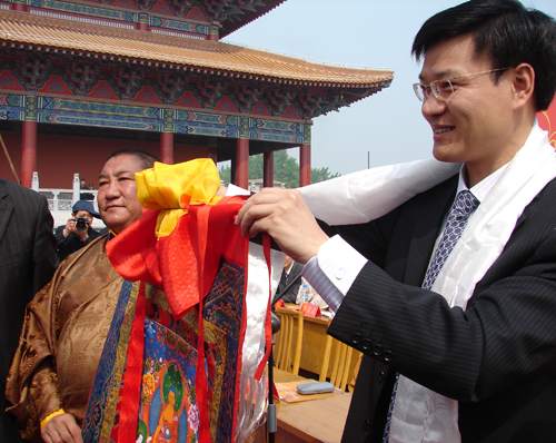 中国政协常委、中国佛协副会长、西藏佛协会长珠康.土登克珠活佛(左)向汶上县赠送唐卡。(右侧为汶上县长孙琪)