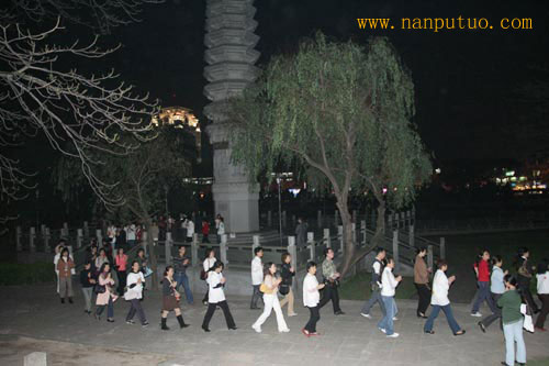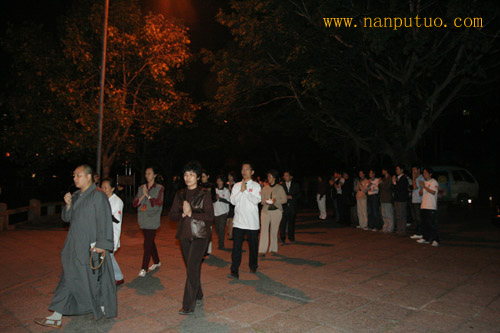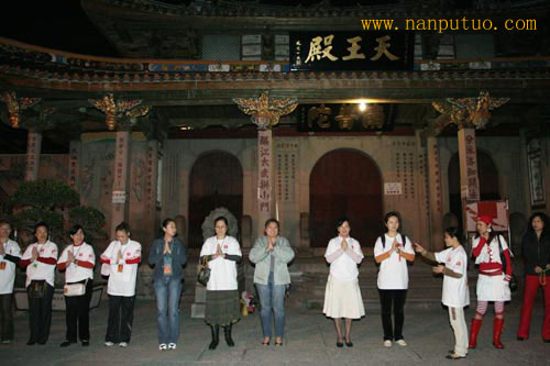4月26日晚,全体义工在南普陀寺天王殿前作了法会彩排演练,法会筹备工作得到厦门山水茗素食茶馆和曙光助学社的大力协助,山水茗素食茶馆5月1日还将提供300份免费快餐给全体义工。
