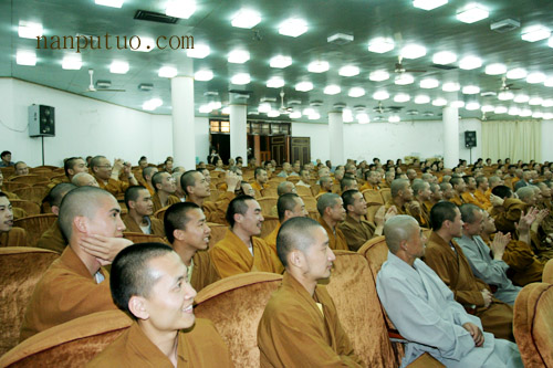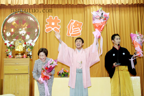 4月27日晚7时,日本相声界大师海名老香叶子女士,林家一平大师,林家胜丸大师在南普陀寺讲堂作精彩表演。我寺方丈则悟大和尚,传明法师、德煌法师、法尊法师、静安法师等各堂口执事,市民宗局一处钟小波先生以及本寺全体僧众、闽院男众部学僧和本寺员工到场观看。