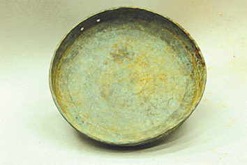 四件铜器深藏一处,依次叠放。最外层为貌似缸的铜器,内放铜锣,锣内放置一个三足铜炉(上有“辛已年”三字),炉内放一铜瓢。近日,四件窖藏铜器出现在我市普迹镇大鸡头村。