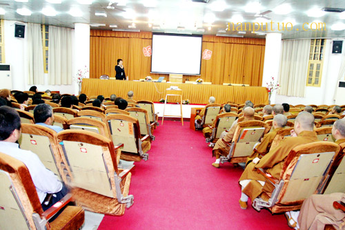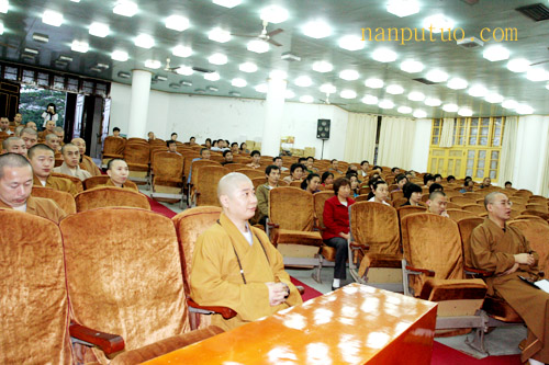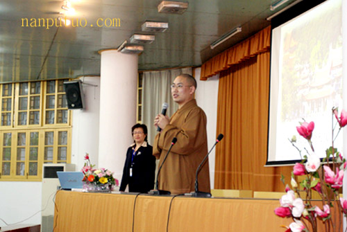 我寺知客法尊法师主持讲座。法师为大家介绍了主讲人王于蓝女士,强调这次讲座是则悟大和尚为加强南普陀僧众以及员工、护法居士的道德素质修养,而特意要求客堂安排举办的。