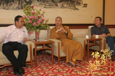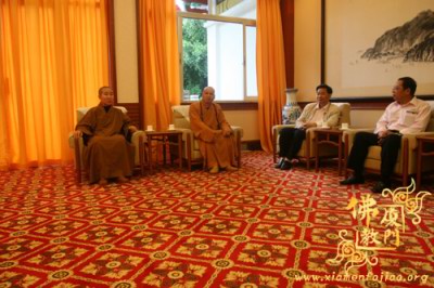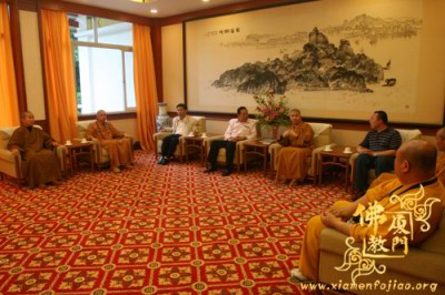 下午4点,厦门佛教协会会长、南普陀寺方丈则悟大和尚,市佛协常务副会长定恒法师,副会长法源法师,民宗局一处苏人登处长,在南普陀普照楼进行友好交流和亲切的座谈。