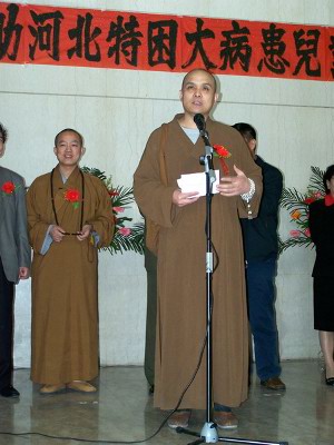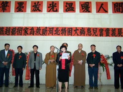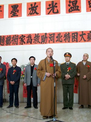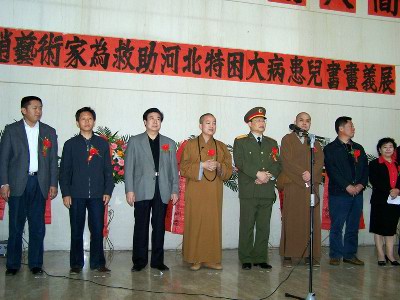 开展仪式上,河北省红十字会张淑琴副会长、著名画僧慧禅法师、柏林禅寺方丈明海法师分别发表了讲话。明海法师在讲话中说:感谢各位艺术家为我们捐献了这么好的作品,同时也要感谢各位义买者的支持。佛教经常讲“不可思议”,众生的业力不可思议,众生的心也不可思议。今天这么多人来参与这个活动,每个人都发出了善心,我相信这善心的力量不仅会改变我们自己未来生活的道路,而且也会改变这个世界。