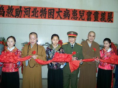 之后,由河北省民宗厅张兴堂副厅长、河北省红十字会张淑琴副会长和明海法师为捐赠作品的艺术家颁发荣誉证书,并为仪式进行了剪彩。