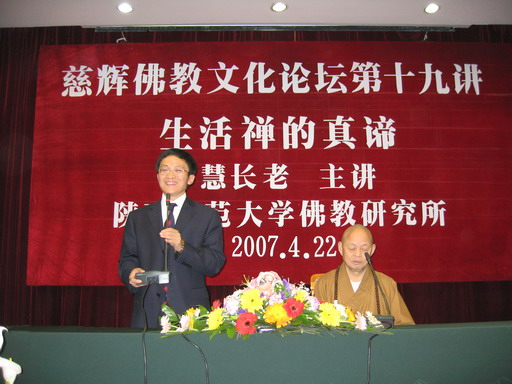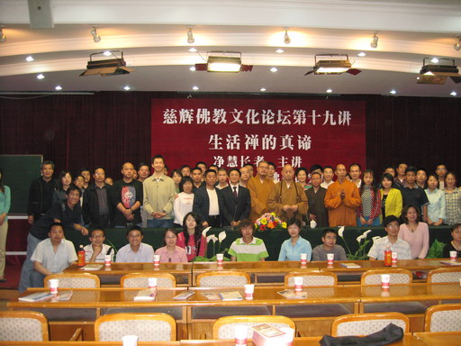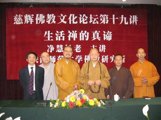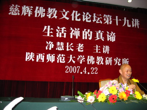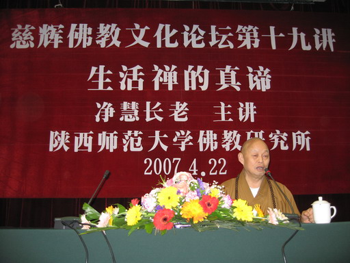2007年4月22日,慈辉佛教文化论坛第十九讲在陕西师范大学雁塔校区启夏苑学术报告厅隆重举行。应陕西师范大学佛教研究所之邀,中国佛教协会副会长、“生活禅”理念创立人净慧长老,作了题为“生活禅的真谛”的演讲。讲座由《中国禅学》主编、佛学研究网主编、佛教所所长吴言生教授主持。终南山净业寺本如法师、道安寺住持宽严法师、慈辉佛教基金会干事田鸿刚先生,以及陕西师范大学百余名师生聆听了讲座。
