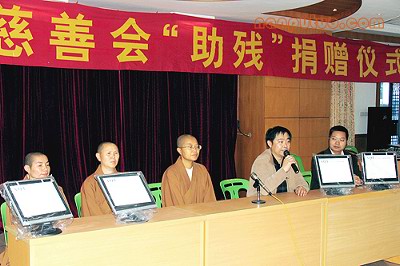 24日上午,普陀法师、德鸣法师等人代表慈善会向特殊教育学院的学生们赠送20台15寸液晶电脑,总价值11.5575万元,希望给孩子们提供一个良好的学习条件。