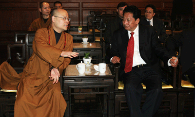 张庆黎一行非常关心宗教及灵隐的人文景观。监院光泉法师详细地向他们介绍了灵隐历史、文化,以及相关佛教义理。光泉法师说:灵隐寺建于东晋咸和元年,至今已有一千六百多年的历史了,她历尽沧桑,此中的兴衰早已铸就了一部“千年灵隐”的史书。而今好了,灵隐寺在党和政府的关怀下,在寺僧们的不断努力和进取中,虽还没有达到吴越王时代的昌盛,但也可用“法运兴隆”四字形容。法师还说,目前我寺经济不但能自给自足,而且还能回报社会。下半年我寺有个水陆法会,我们就打算把法会善款来支援贫困地区,特别是目前经济还不够发达的西藏地区。
