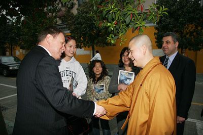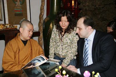 2007年4月5日下午,春光明媚,和风抚面。来宁波参加国际家居博会的格鲁吉亚驻华大使米哈伊尔·乌克列巴、参赞约瑟布·阿巴什泽和立陶宛驻华大使罗卡斯·贝尔诺塔斯及夫人一行莅临七塔禅寺访问,受到可祥法师等的热情接待。在佛前敬香后,宾主双方在丈室会客厅进行了友好交流。