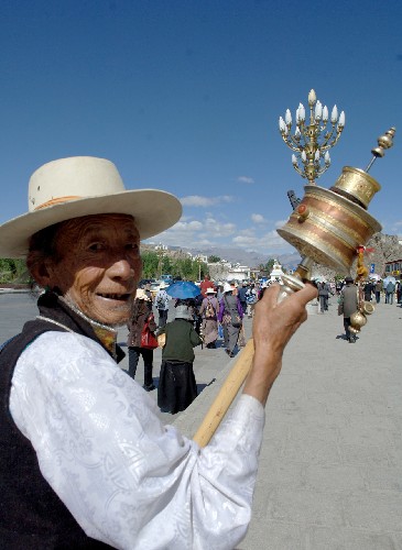 5月24日,手持转经筒的拉萨信教群众在林廓路上转经。