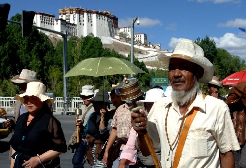 5月24日,70岁的藏族老人手持转经筒在绕布达拉宫转经。