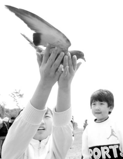 4岁的罗伊宁捧着小鸽子说,“飞呀,飞呀!”小鸽子都飞不起来了,“鸽子受伤了,拿回家养着行吗?”看着小伊宁可爱的样子,姑姑罗爽说,“带孩子来参加这种活动是为了从小就培养孩子的爱心,让她知道生命的可贵。”