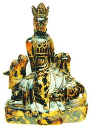 细细端详此佛,她以一种完全贴近平民化的无拘坐姿,侧骑于一卧伏的天禄(又称辟邪)之背。一手扶搭于随意跷搁在兽背的左膝上,一手支撑于骑兽的项脊。顶挽宝瓶形发髻,头戴化佛天冠,两绺秀发长垂过胸。微裸的上身悬荡数串珍珠璎珞,轻盈飘动的天衣从双肩披落至脚踝,右腿自兽背轻轻滑落,跣足触踏于地。脸上泛起纯洁无邪的微笑与若有所悟的会心,交织出慈悲菩萨特有的表情。其微阖的眼帘,令凡尘俗辈们难以洞察出隐藏于内的一双慧眼是多么的深邃与明亮。这动静相济的观音造型,既显示出华夏良母贤妻形女性柔美多姿的风韵,又不失观音菩萨的沉稳与庄严。观音座下那头独角、鹿身、马尾的瑞兽天禄,取仰首回望之势,与其上菩萨桴鼓相应,似已彻悟了观音菩萨镇恶送吉、普渡众生的禅意。