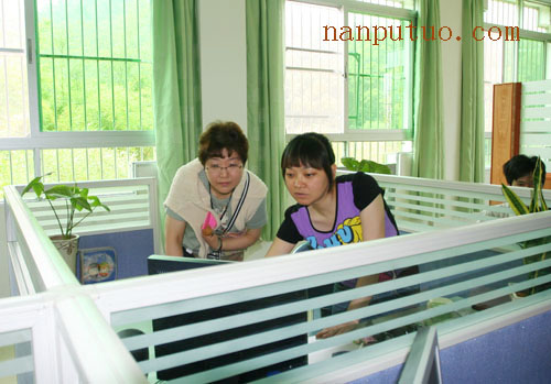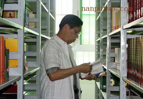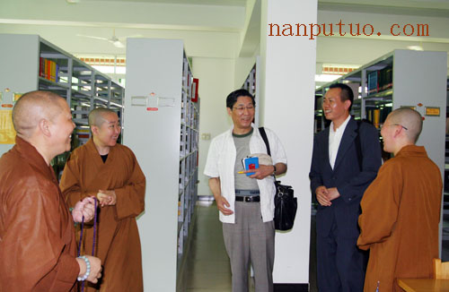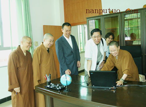 在图书馆,听完管理员今超法师对书籍种类、编类安置等介绍,木村宣彰教授仔细地翻阅着馆内的所藏书籍,并对此表示赞叹。来到网站,负责人祖光法师打开南普陀网页,向来访客人介绍网页框架结构和各版块的内容,并告诉来访者,目前网页中内容还不够完备,正在添加之中。木村宣彰教授聚精会神地浏览着网页,对网站的工作表示高度赞赏。