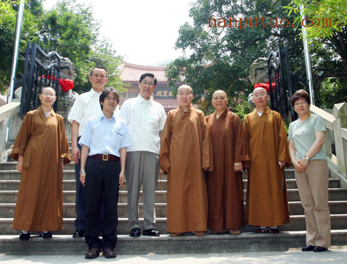 走出网站,大家在大雄宝殿前的台阶上合影留念。木村宣彰教授风趣的称赞道:“你们已经把佛教与现代文化完美的结合在一起”,经过林观潮先生的翻译,引起大家欢笑。