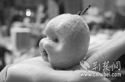 昨日,记者在汉口集贤花园吴女士家中看到了这只奇特古怪的香梨。吴女士说,这只香梨是今年春节时在朋友送的一箱梨中发现的。为了保鲜,她一度将“梨菩萨”请进冰箱。